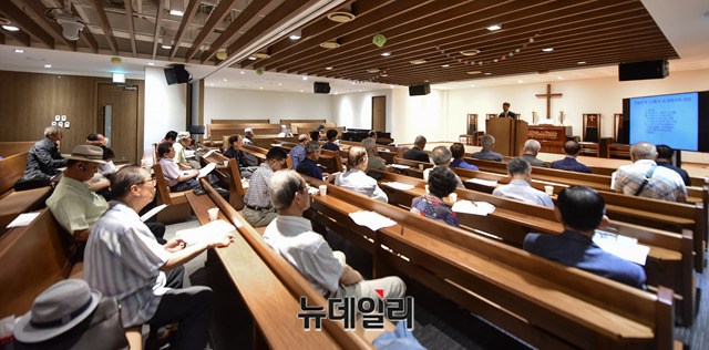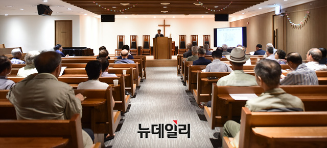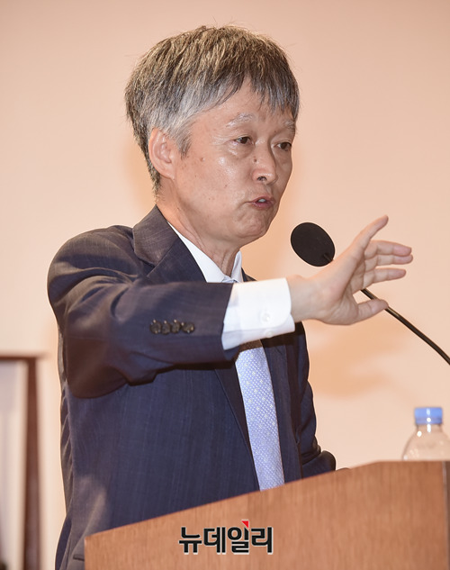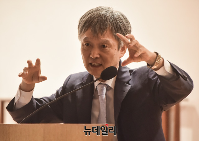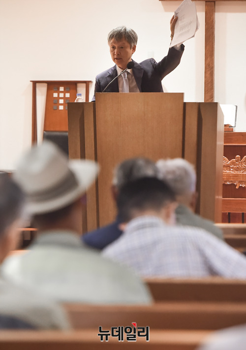 이복규 서경대 교수가 20일 오후 서울 중구 정동제일교회 아펜젤러홀에서 열린 제102회 이승만포럼에서 이승만 작 '고목가'의 문학사적 의의를 주제로 강연하고 있다. 이날 이 교수는 '고목가'는 한글작품 중 최초의 신체시라는 것을 논증했다.