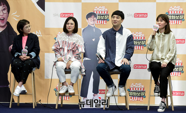 개그우먼 박지선이 20일 오후 서울 마포구 스탠포드호텔에서 열린 스카이드라마 '송은이 김숙의 영화보장' 제작발표회에서 프로그램 소개를 하고 있다.