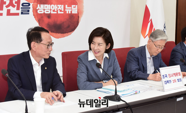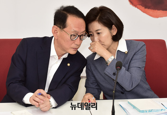나경원 자유한국당 원내대표와 김도읍 의원이 21일 오전 국회에서 열린 조국 인사청문회 대책TF 2차회의에서 대화를 나누고 있다.
