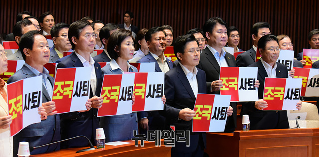 황교안 자유한국당 대표, 나경원 원내대표를 및 의원들이 21일 오후 국회에서 열린 의원총회에서 조국 법무부장관 후보자의 사퇴를 주장하며 피켓을 들고 있다.