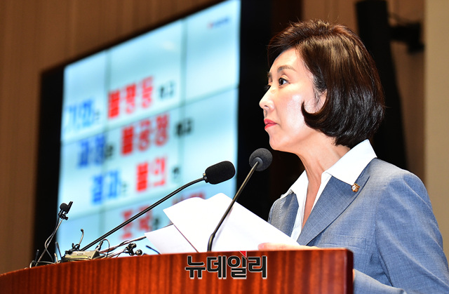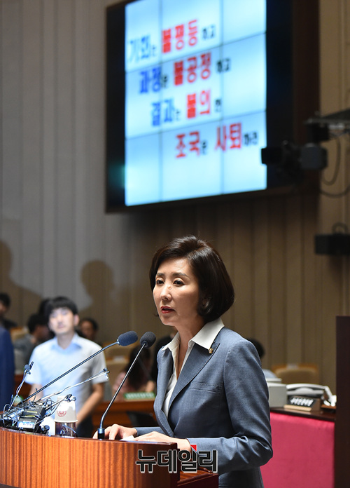 나경원 자유한국당 원내대표가 21일 오후 국회에서 열린 의원총회에서 '조국 법무부장관 후보자' 관련 발언을 하고 있다.