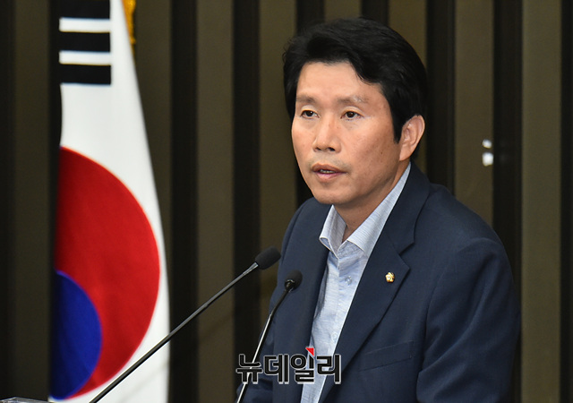 이인영 더불어민주당 원내대표가 21일 오후 국회에서 열린 의원총회에서 모두발언을 하고 있다.