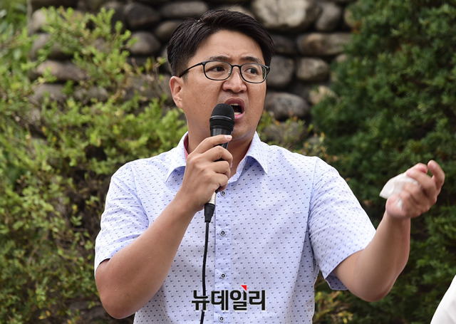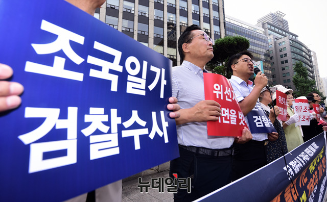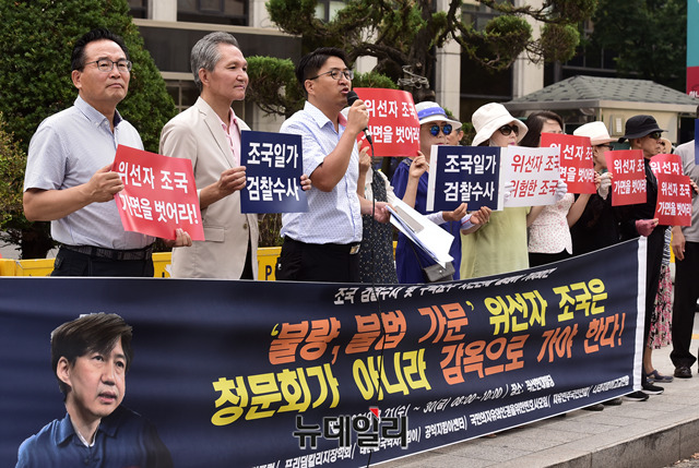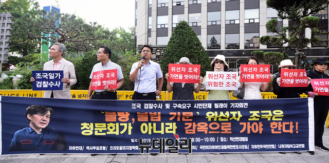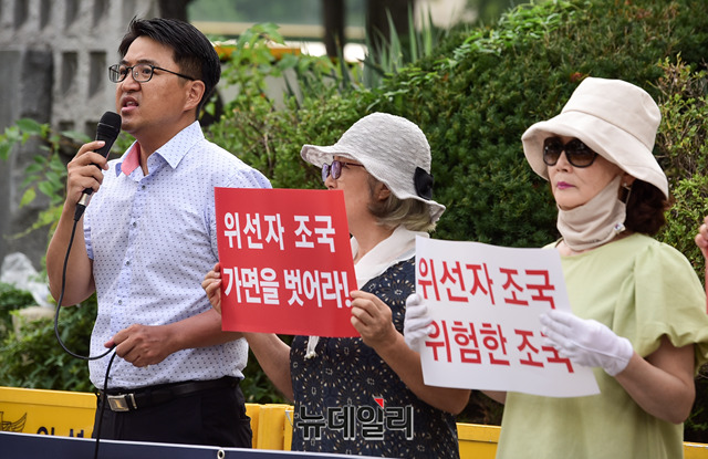 나지훈 역사두길포럼 사무총장 및 자유연대, 공익지킴이센터 등 우파단체가 22일 오전 서울 종로구 적선현대빌딩에서 열린 조국 법무부장관 후보자의 인사청문회 준비사무실 앞에서 조 후보자의 사퇴를 촉구하는 기자회견을 갖고 있다.