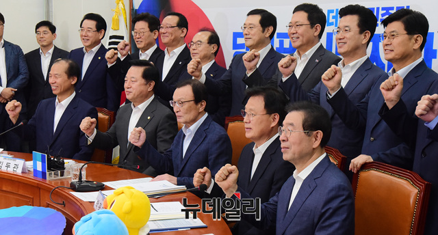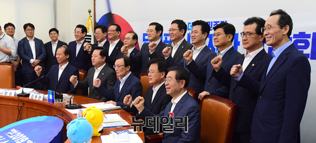 이해찬 더불어민주당 대표가 22일 오전 국회에서 열린 시도지사 간담회 참석자들과 기념촬영을 하고 있다. 이날 간담회에는 최문순 시도지사협의회장, 김두관 참좋은 지방정부 위원장, 박광온 최고위원, 박원순 서울시장, 김영록 전남도지사, 이재명 경기도지사, 송철호 울산시장, 오거돈 부산시장, 이용섭 광주시장, 박남철 인천시장, 허태정 대전시장, 이춘희 세종시장, 이시종 충북도지사, 송하진 전북도지사 등 이 참석했다.