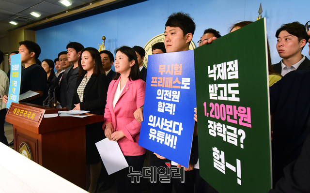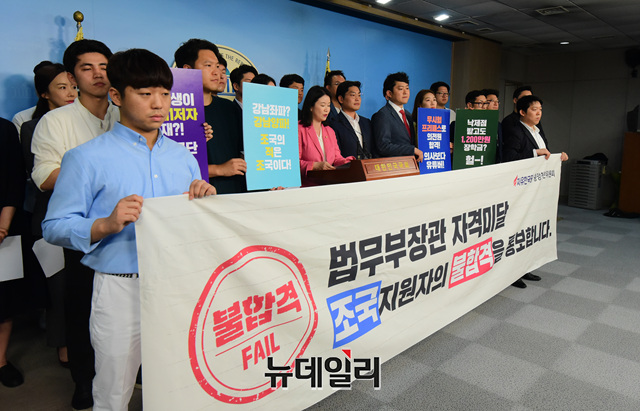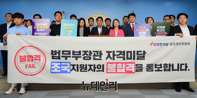 신보라 자유한국당 의원과 중앙청년위원회 위원들이 22일 오후 국회 정론관에서 기자회견을 갖고 조국 법무부 장관 후보자 자진사퇴 및 검찰 수사를 촉구하고 있다.