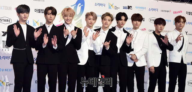 아이돌그룹 스트레이키즈가 22일 오후 서울 송파구 올림픽공원 올림픽홀에서 열린 '2019 소리바다 어워즈(2019 SORIBADA BEST K-MUSIC AWARDS, 이하 2019 SOBA)' 블루카펫 행사에서 포토타임을 갖고 있다.