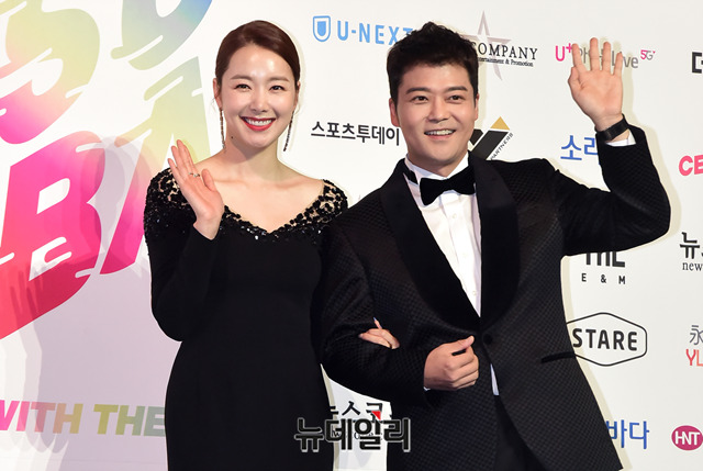 배우 소이현(왼쪽), 아나운서 전현무가 22일 오후 서울 송파구 올림픽공원 올림픽홀에서 열린 '2019 소리바다 어워즈(2019 SORIBADA BEST K-MUSIC AWARDS, 이하 2019 SOBA)' 블루카펫 행사에서 포토타임을 갖고 있다.