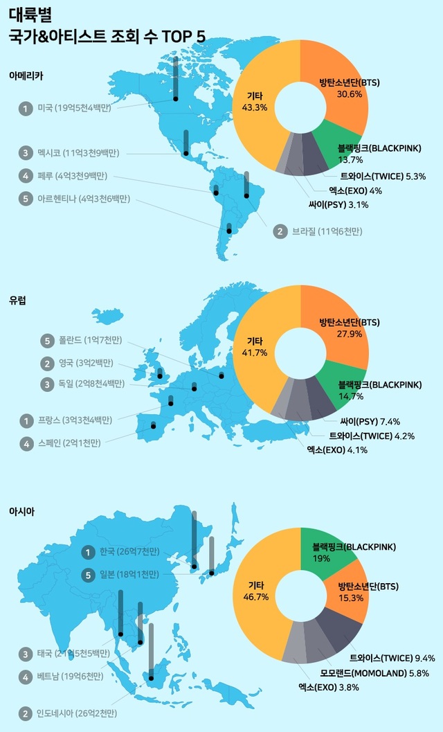 지난해 7월 1일부터 올해 6월 30일까지 케이팝 아티스트 76팀의 유튜브 데이터를 기반으로 제작된 이번 지도에는 한눈에 보는 국가별 케이팝 현황부터 대륙별 케이팝 인기 국가와 아티스트 순위, 케이팝 인기를 주도하는 5대장 등이 담겨있다.