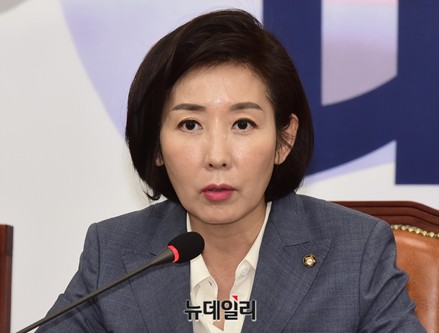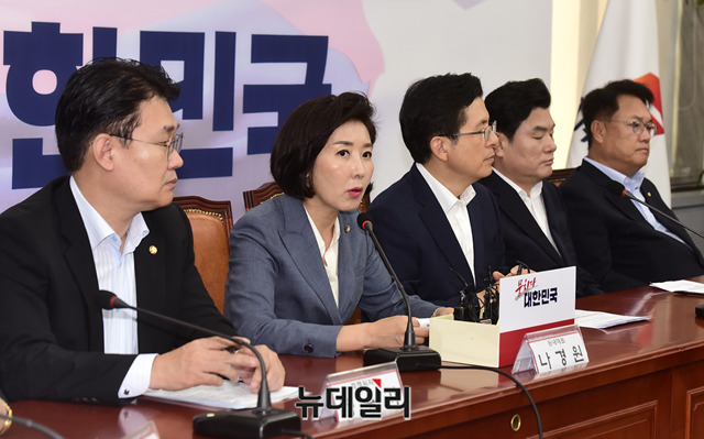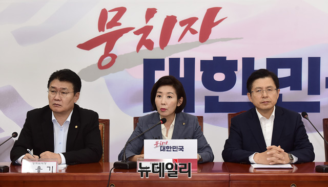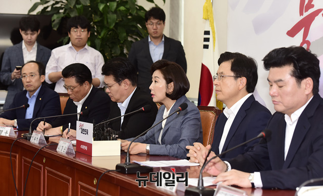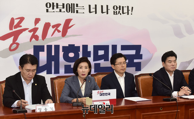 나경원 자유한국당 원내대표가 23일 오전 국회에서 지소미아 종료와 관련해 열린 긴급 안보연석회의에서 모두발언을 하고 있다 .