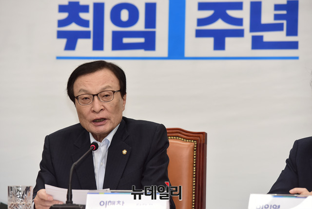 이해찬 더불어민주당 대표가 23일 오전 국회에서열린 당대표·최고위원 취임 1주년 공동 기자회견에서 모두발언을 하고 있다.
