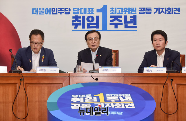 [포토] 민주당 대표·최고위원 취임 1주년 기자회견, 발언하는 이해찬