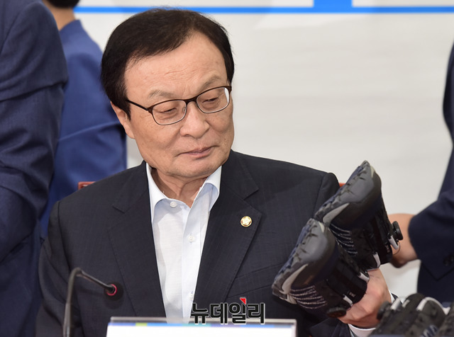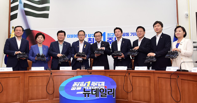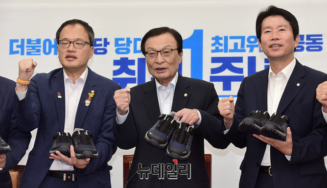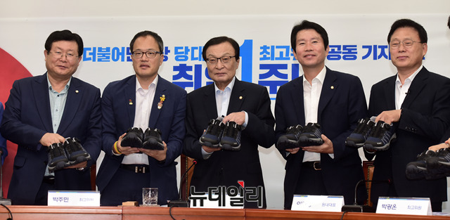 이해찬 더불어민주당 대표, 이인영 원내대표 및 최고위원들이 23일 오전 국회에서열린 당대표·최고위원 취임 1주년 공동 기자회견에서 열심히 뛰자는 취지의 운동화를 들고 기념촬영을 하고 있다.