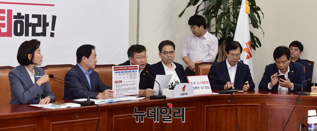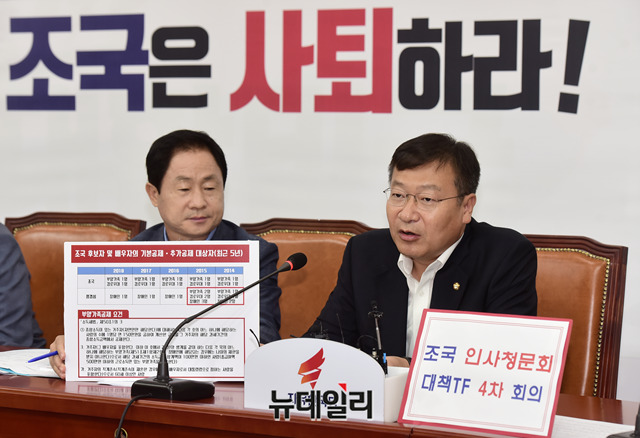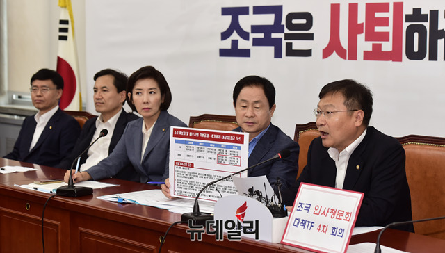 정점식 자유한국당 의원이 23일 오전 국회에서 열린 '조국 인사청문회 대책TF 4차 회의'에서 모두발언을 하고 있다.