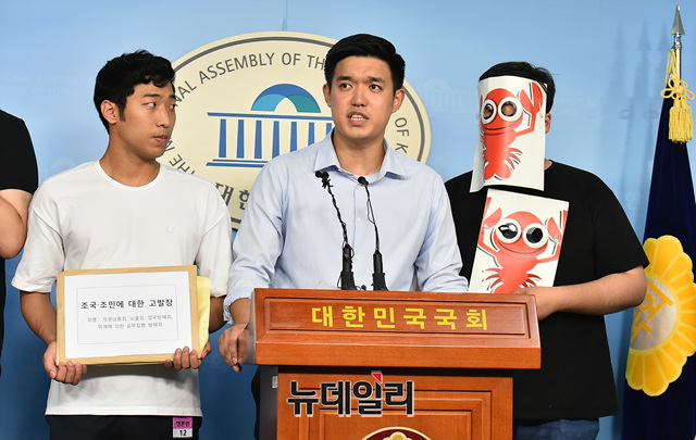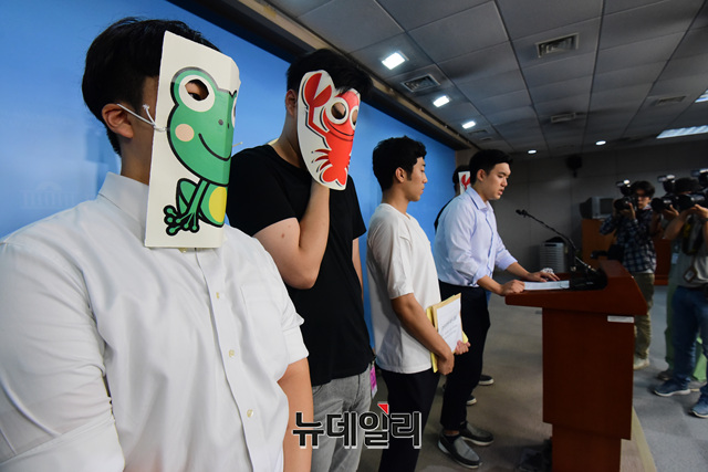 공정사회를 위한 대학생모임 학생들이 23일 오전 국회 정론관에서 가재, 개구리 가면을 착용하고 조국 법무부 장관 후보자 사퇴촉구 기자회견을 갖고 있다.