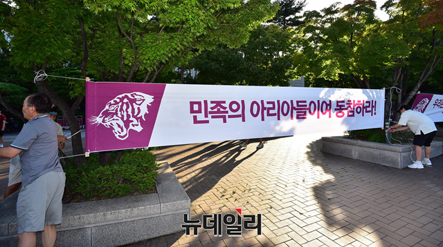 고려대 학생들이 23일 오후 서울 성북구 고려대학교 중앙광장에서 열릴 예정인 조국 법무부장관 후보자 규탄집회에 앞서 학생들의 동참을 호소하는 현수막을 설치하고 있다.