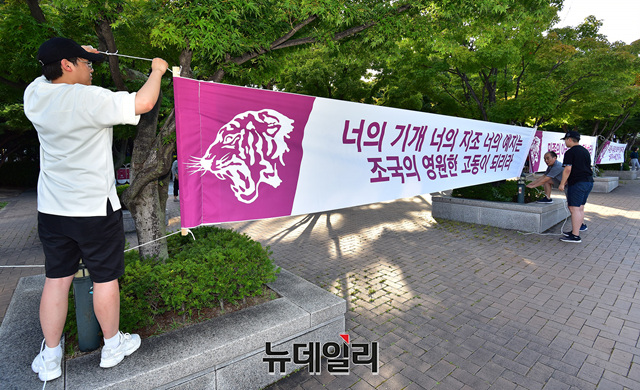 [포토] 조국 규탄… 고려대 중앙광장에 설치되는 현수막
