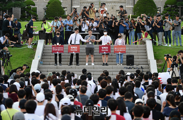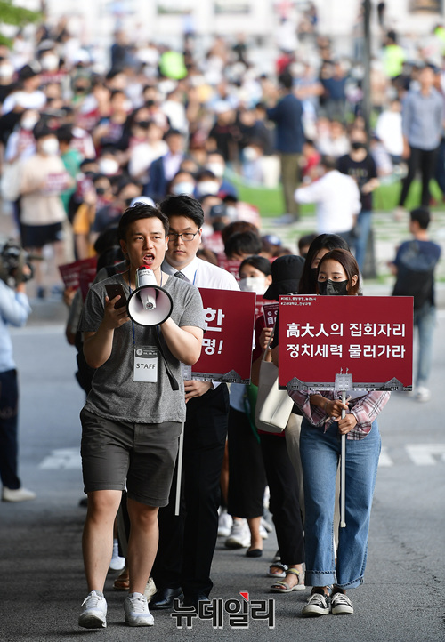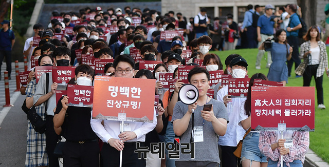 고려대 재학생과 졸업생들이 23일 오후 서울 성북구 고려대학교 중앙광장에서 조국 법무부 장관 후보자 딸의 입학과정에 대한 진상규명을 촉구하는 구호를 외치며 교내를 돌고 있다. 이날 집회에 참석한 시민들은 학생들이 교내를 한 바퀴 돌아 복귀하자 박수를 치며 격려했다.