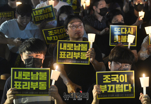 서울대 재학생과 졸업생들이 23일 오후 서울 관악구 서울대학교 아크로광장에서 열린 조국 법무부 장관 후보자의 사퇴 촉구집회에서 손피켓을 들고 있다.