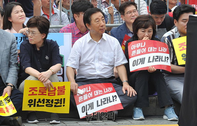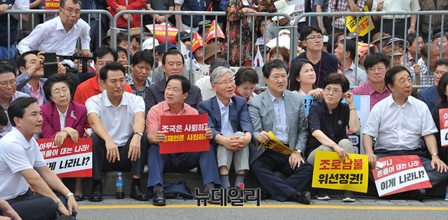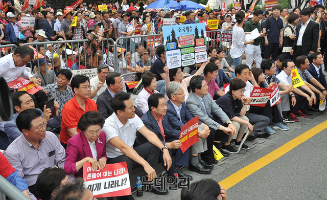 자유한국당 소속 의원들이 24일 오후 서울 종로구 세종문화회관 앞에서 열린 '살리자 대한민국! 文정권 규탄 광화문 집회'에 참석해 자리하고 있다.