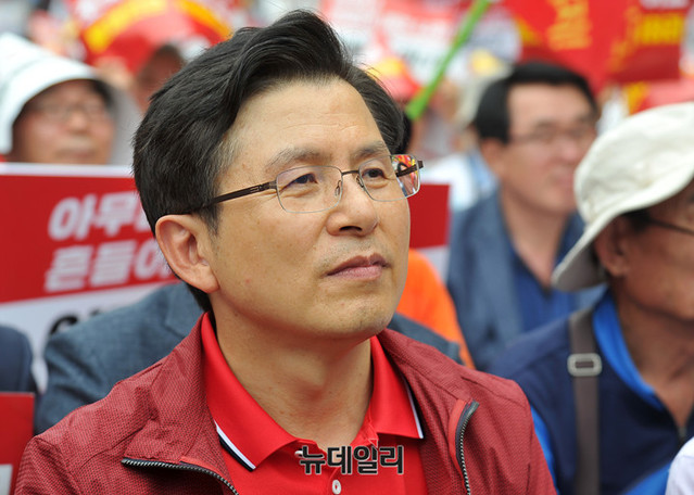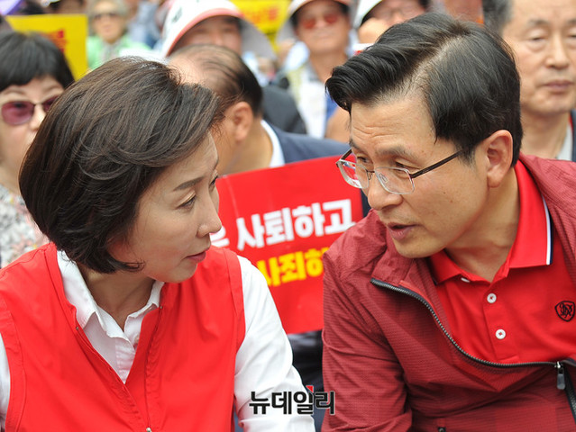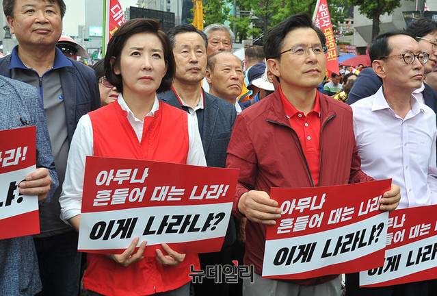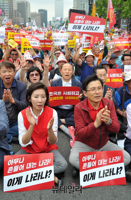 황교안 자유한국당 대표와 나경원 원내대표가 24일 오후 서울 종로구 세종문화회관 앞에서 열린 '살리자 대한민국! 文정권 규탄 광화문 집회'에 참석해 자리하고 있다.