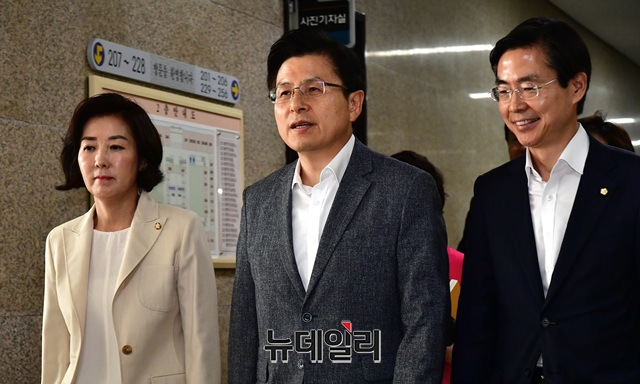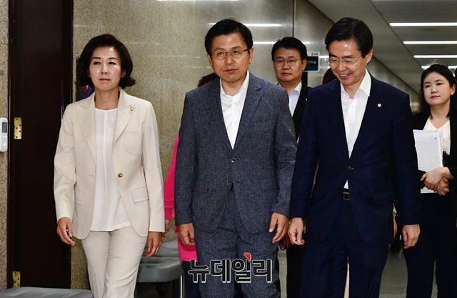 황교안 자유한국당 대표와 나경원 원내대표 등 지도부가 26일 오전 국회에서 열린 최고위원회의에 참석하기 위해 입장하고 있다.