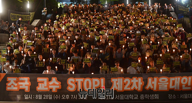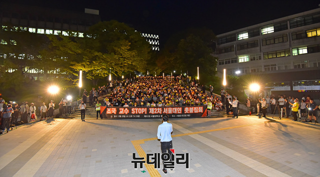 조국 법무부 장관 후보자의 사퇴를 촉구하는 서울대 재학생과 졸업생들이 28일 오후 서울 관악구 서울대 아크로광장에서 사퇴 촉구를 요구하는 구호를 외치고 있다. 23일 1차집회에 이은 이날 집회는 서울대총학생회가 주도해 진행됐다.