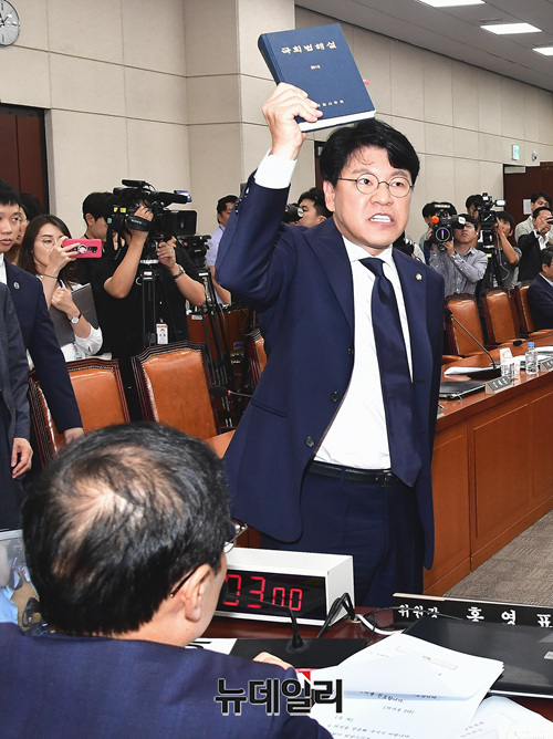 정개특위 장제원 자유한국당 간사가 29일 오전 국회에서 열린 정치개혁특별위원회 전체회의에서 선거법 개정안 처리되자 항의하며 국회법 해설집을 더지고 있다.