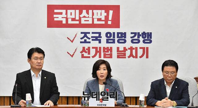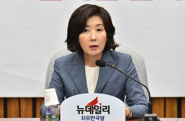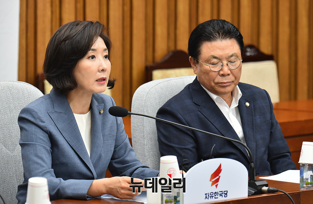 나경원 자유한국당 원내대표가 30일 오전 국회에서 열린 원내대책회의에 참석해 모두발언을 하고 있다.