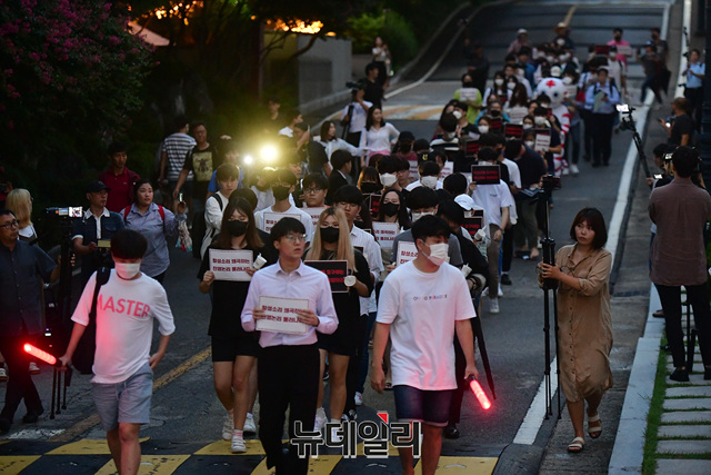 조국 법무부 장관 후보자 딸의 입시비리 의혹의 진상규명을 촉구하는 고려대학교 2차 촛불집회가 30일 오후 서울 성북구 고려대학교 중앙광장에서 진행된 가운데 학생들이 대학본부에 진상규명을 촉구하는 메모를 붙이고 있다.