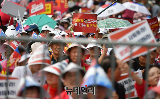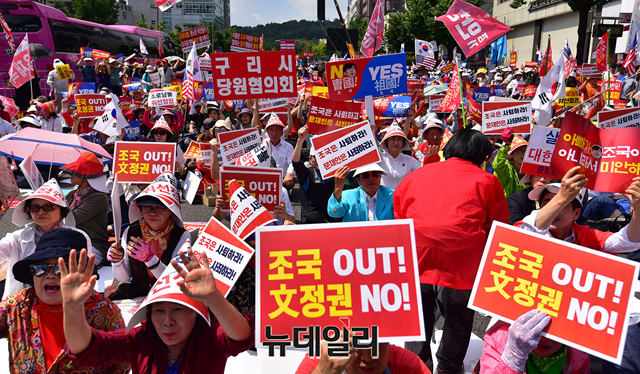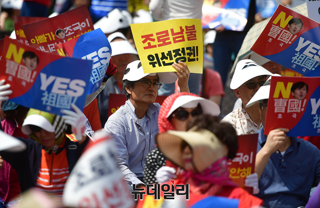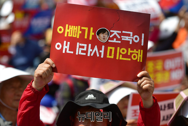 문재인 정권을 규탄하는 집회 참가자가 31일 오후 서울 종로구 사직공원 인근에서 열린 집회에서 조국을 규탄하는 손피켓을 들고 자리하고 있다.