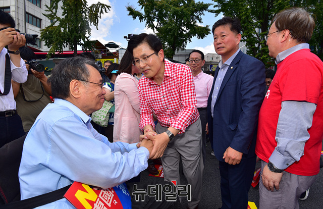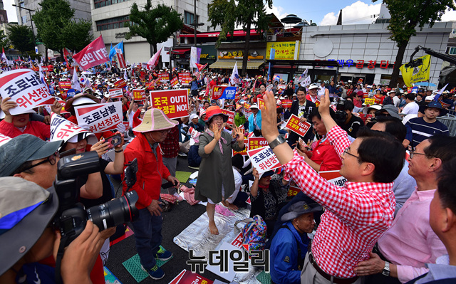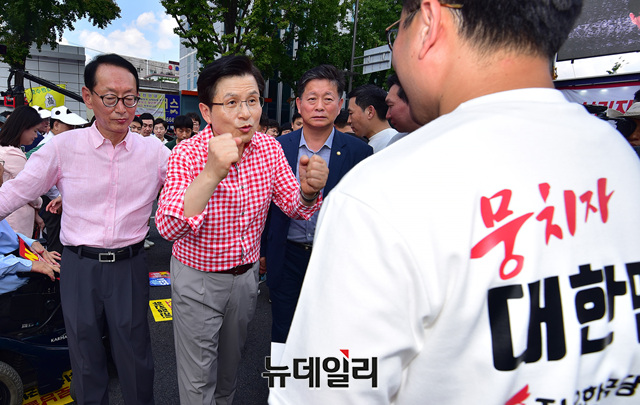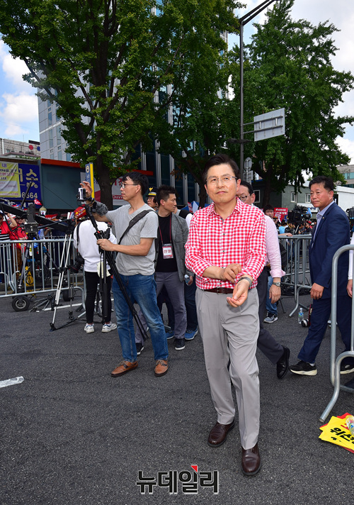 황교안 자유한국당 대표가 31일 오후 서울 종로구 사직공원 인근에서 열린 문재인 정권 규탄 집회에 입장하며 인사를 나누고 있다.