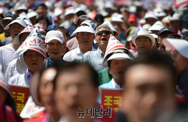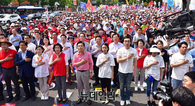 황교안 자유한국당 대표, 나경원 원내대표, 김정재 원내부대표, 김문수 전 경기지사 등 당원들이 31일 오후 서울 종로구 사직공원 인근에서 열린 문재인 정권 규탄 집회에 앞서 국민의례를 하고 있다.