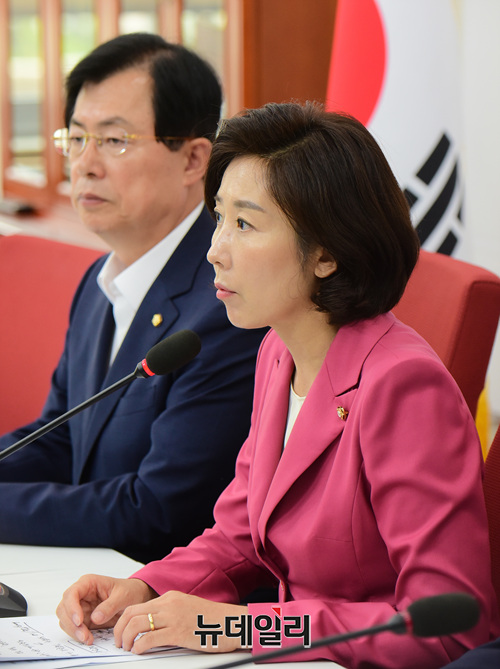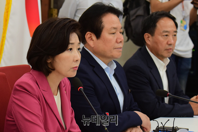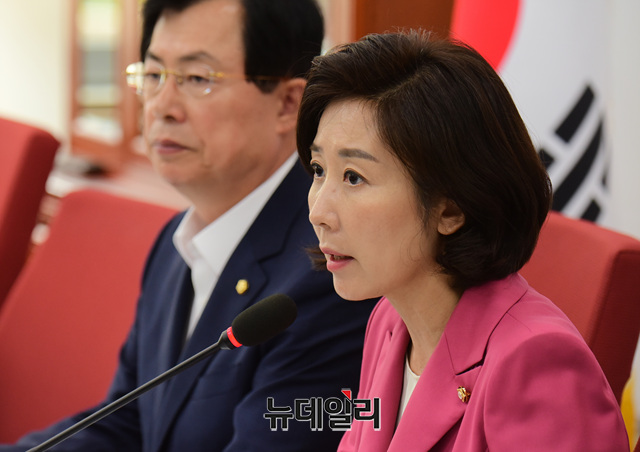 나경원 자유한국당 원내대표가 2일 오전 국회 원내대표실에서 열린 긴급 기자간담회에서 발언을 하고 있다. 이날 나 원내대표은 "조국 부인·딸·모친 증인 양보하겠다"며 "법대로 청문회 미루자"고 의견을 밝혔다.