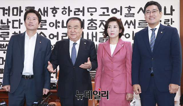 문희상 국회의장과 야야3당 원내대표가 2일 오전 국회에서 열린 국회의장 원내대표회동에서 기념 사진을 촬영하고 있다. (왼쪽부터 이인영 더불어민주당, 문 의장, 나경원 자유한국당 오신환 바른미래당)
