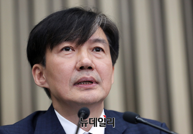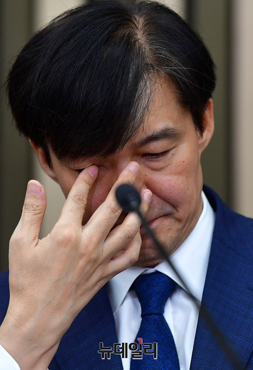 조국 법무부 장관 후보자가 2일 오후 국회에서 자처한 대국민 기자회견에 참석해 자리하고 있다. (사진=공동취재단)