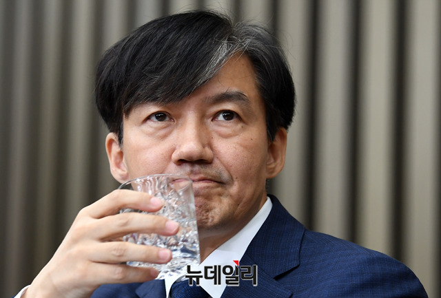 조국 법무부 장관 후보자가 2일 오후 국회에서 열린 대국민 기자회견에서 물을 마시고 있다.