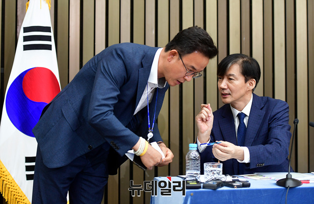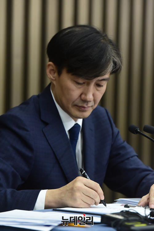 조국 법무부장관 후보자가 2일 국회에서 열린 기자간담회에서 일본제품인 '제스트림' 펜을 들고 메모하고 있다. 죽창가를 주창하며 "반일"을 외치던 조국 후보자가 일본 펜을 사용한다는 말이 기자들 사이에서 돌았다. 조 후보자는 펜과 연필 등 여러 가지 필기구를 동시에 늘어놓고 돌아가며 사용하다, 논란이 되는 일본 펜을 다른 곳으로 치웠다.