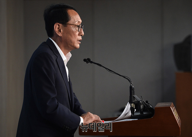 김도읍 국회 법제사법위원회 간사가 2일 오후 국회 정론관에서 조국 법무부 장관 후보자의 기자간담회와 관련해 발언하고 있다. 김 의원은 "웅동학원 비리, 사모펀드 불법성 등에 대해서 조 후보자는 '가족들이 한 일이라 모른다'고 했다. 이런 해명이 어디 있나"며 "조 후보자의 변명은 국민의 공분만 더 살 것"이라며 조 후보자의 사퇴를 촉구했다.
