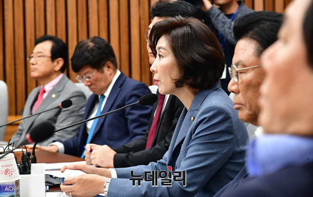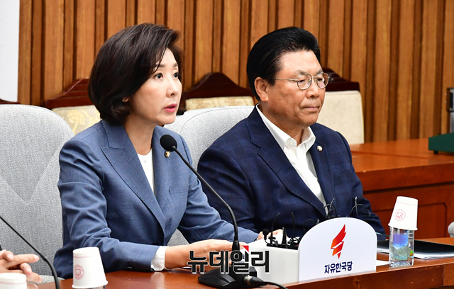 나경원 자유한국당 원내대표가 3일 오전 국회에서 열린 원내대책회의에서 모두발언을 하고 있다.