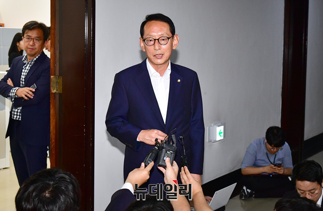 김도읍 국회 법사위 자유한국당 간사가 3일 오전 국회에서 조국 법무부 장관 후보자 인사청문 관련 취재진 질문에 답하고 있다.