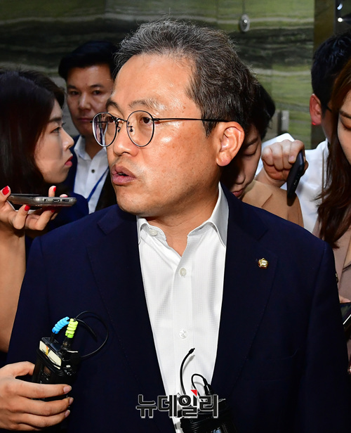 송기현 국회 법사위 더불어민주당 간사가 3일 오전 국회에서 조국 법무부 장관 후보자 인사청문 관련 취재진 질문에 답하고 있다.