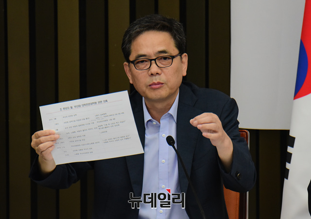 곽상도 자유한국당 의원이 3일 오후 국회에서 열린 '조국 후보자의 거짓과 선동' 대국민 고발 언론간담회에서 발언을 하고 있다.