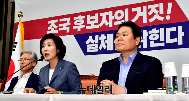 나경원 자유한국당 원내대표가 3일 오후 국회에서 열린 '조국 후보자의 거짓과 선동' 대국민 고발 언론간담회에서 발언을 하고 있다.