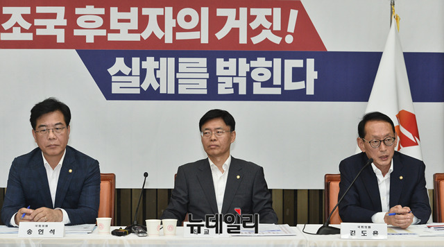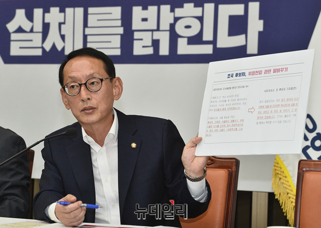 김도읍 자유한국당 의원이 3일 오후 국회에서 열린 '조국 후보자의 거짓과 선동' 대국민 고발 언론간담회에서 웅동학원 및 부동산 의혹과 관련 발언을 하고 있다.