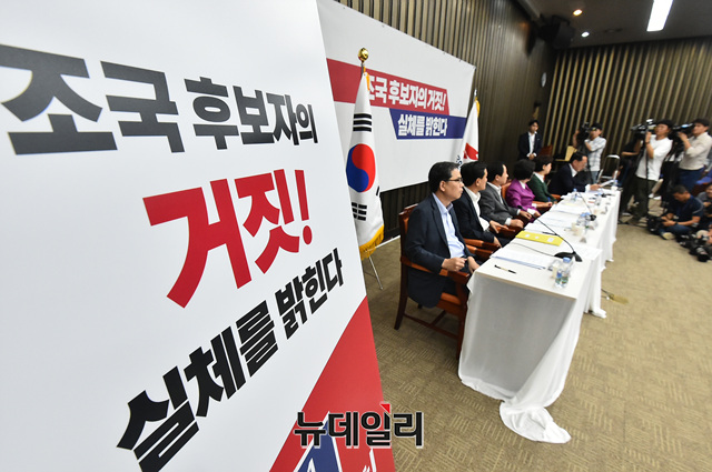 '조국 후보자의 거짓과 선동' 대국민 고발 언론간담회가 3일 오후 국회에서 열린 가운데 의원들이 발언을 하고 있다.
