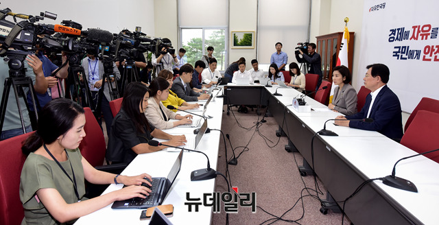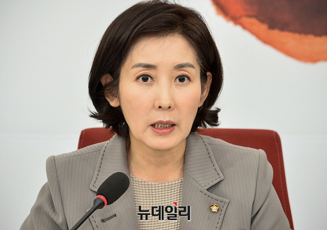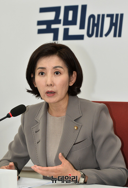 나경원 자유한국당 원내대표가 4일 오후 국회에서 조국 법무부장관 후보자 인사청문회 관련 기자회견을 갖고 있다. 이날 나 원내대표는 "여야가 6일 가족증인 없이 조 후보자 인사청문회 실시를 합의했다"고 밝혔다.