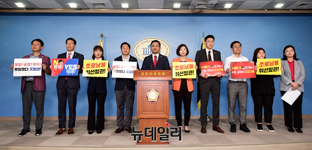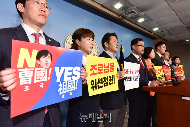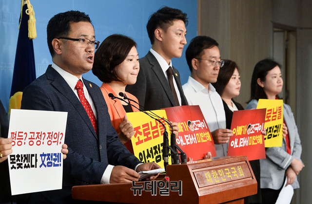 신보라 자유한국당 의원과 소속 광역기초의회 청년의원들이 4일 오후 국회 정론관에서 조국 법무부장관 후보자 사퇴를 촉구하는 기자회견을 하고 있다.