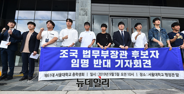 서울대학교 총학생회와 각 단과대 학생회장들이 5일 오전 서울대학교 관악캠퍼스 행정관 앞에서 '조국 법무부 장관 후보자 임명 반대' 기자회견을 갖고 있다.