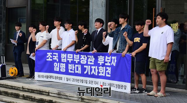 서울대학교 총학생회와 각 단과대 학생회장들이 5일 오전 서울대학교 관악캠퍼스 행정관 앞에서 '조국 법무부 장관 후보자 임명 반대' 기자회견을 열고 규탄구호를 하고 있다.