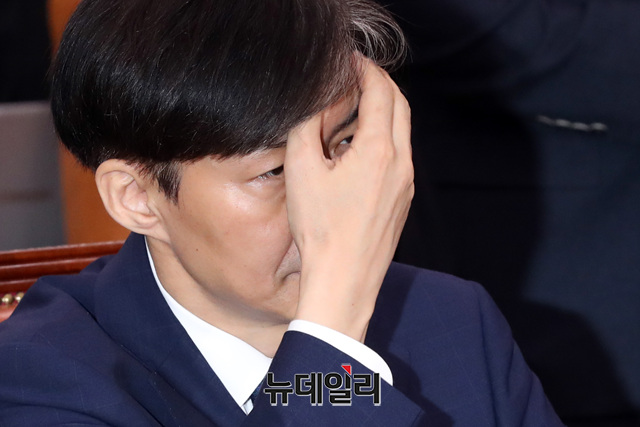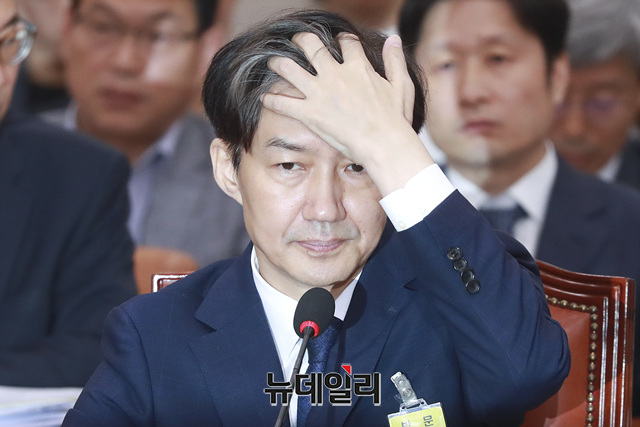 조국 법무부 장관 후보자가 6일 오전 국회 법제사법위원회에서 열린 인사청문회에 출석해 머리를 만지고 있다.